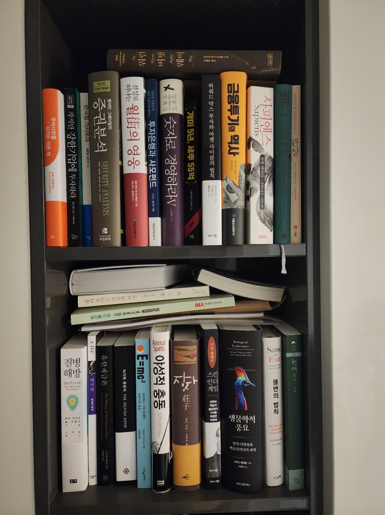 내가 투자를 하면서 가장 기쁜 점은, 투자를 하기 위해 처음에는 주식, 돈에 관련한 책을 보다가 보다 보니 투자로 돈을 벌려면 다양한 교양과 지식이 필요하다는 것을 알게 됐고, 지금은 분야를 가리지 않고 다독을 하는 것이 어느정도 습관화 됐다는 것이다. 나는 주로 『총, 균, 쇠』, 『종의 기원』, 『생각에 관한 생각』 같은 두꺼운 벽돌책을 좋아한다. 책도 유행이 있다고 생각해서 유행을 따르기보다는 어느 시대에서나 읽혀져 왔고, 미래에도 읽힐 것 같은 시대를 관통하는 책들을 좋아한다. 물론 읽을 때는 힘들기는 하지만..